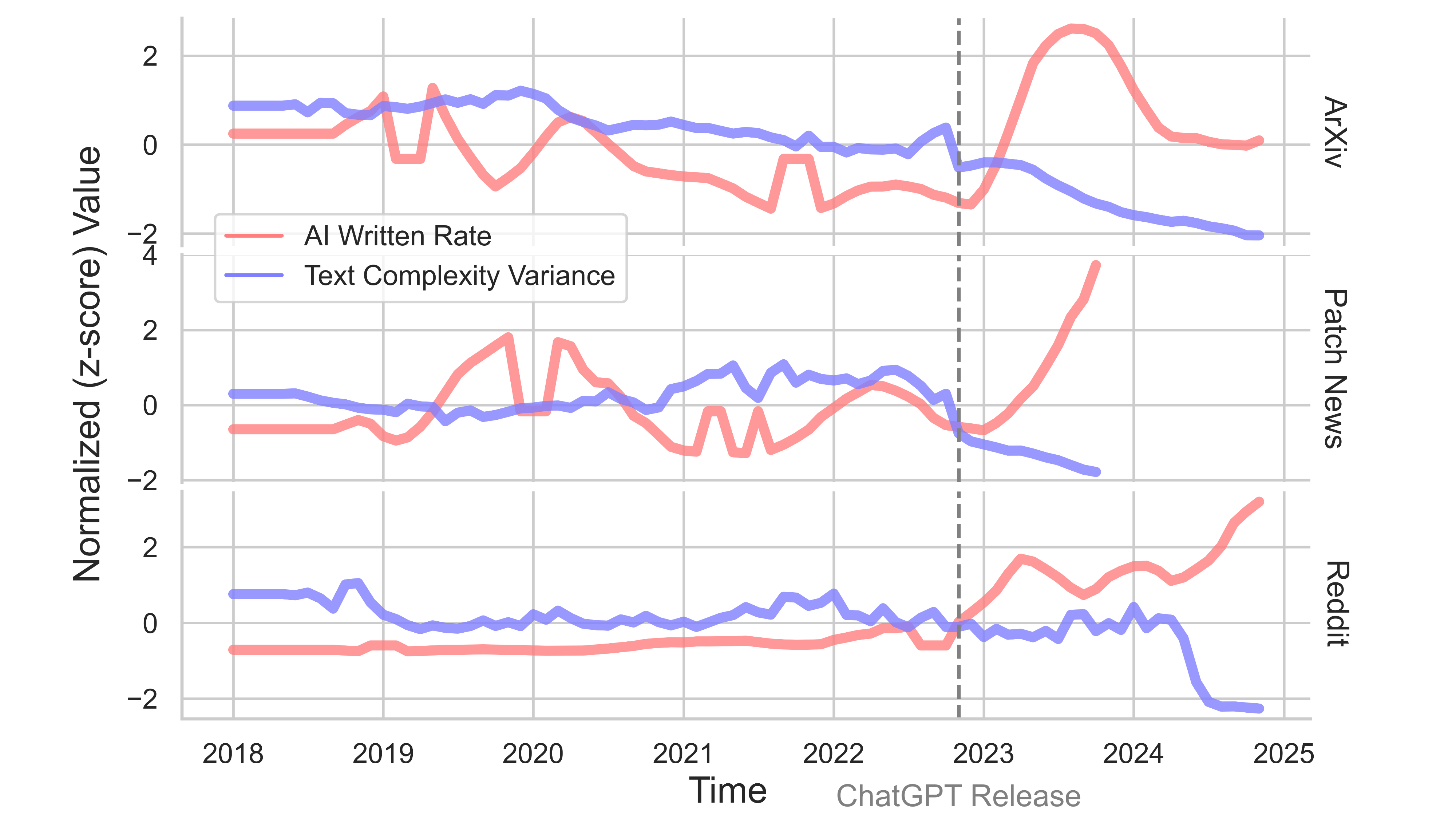 Overall, we see that the text complexity goes down in all three sources, albeit with different adoption rates. The textual complexity here is a combination of different metrics that say something about the “richness” of text, for example the number of unique words, or the average length between syntactic dependencies in the text.