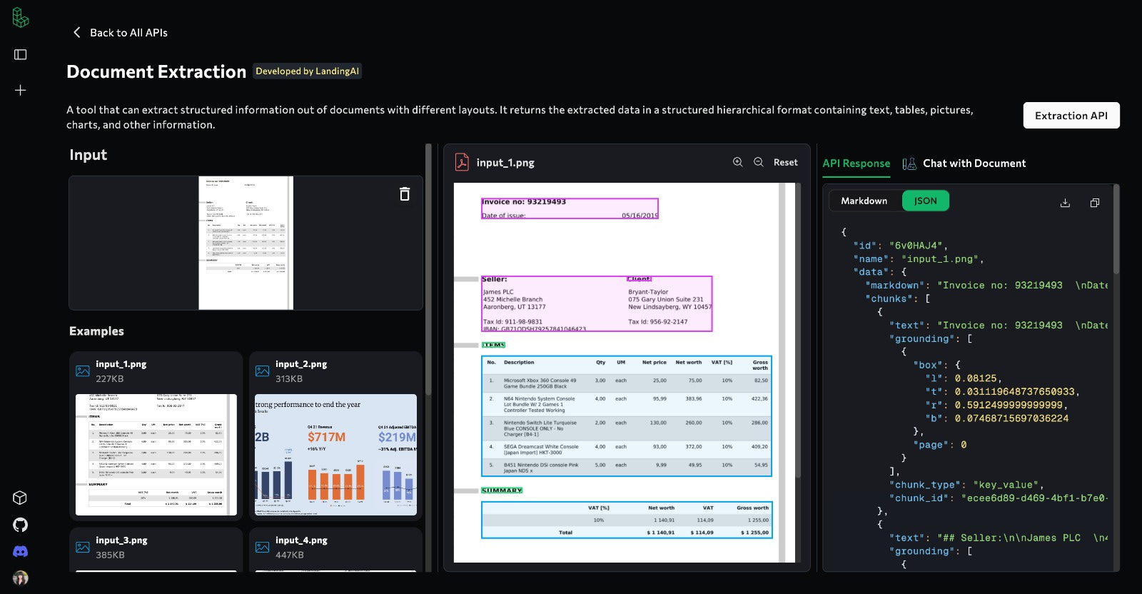 A preview of Landing AI’s document extraction. Structured data is obtained from highlighted PDF and can be returned in either markdown or json format.