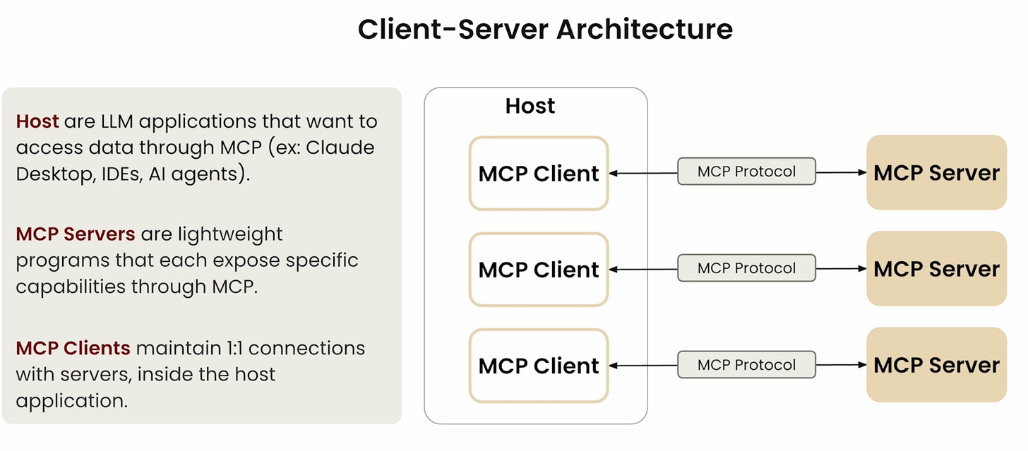 If you work with agentic systems, you’ve probably heard the terms Function Calling or Tool Use. Let’s say you’re building a research agent to analyze data or documents. You might want to connect your agent to GitHub repositories or Google Drive documents to fetch relevant files. Instead of you writing your own tools for these integrations, MCP allows you to expose available tools to your agents via an MCP server and use them across many different applications.