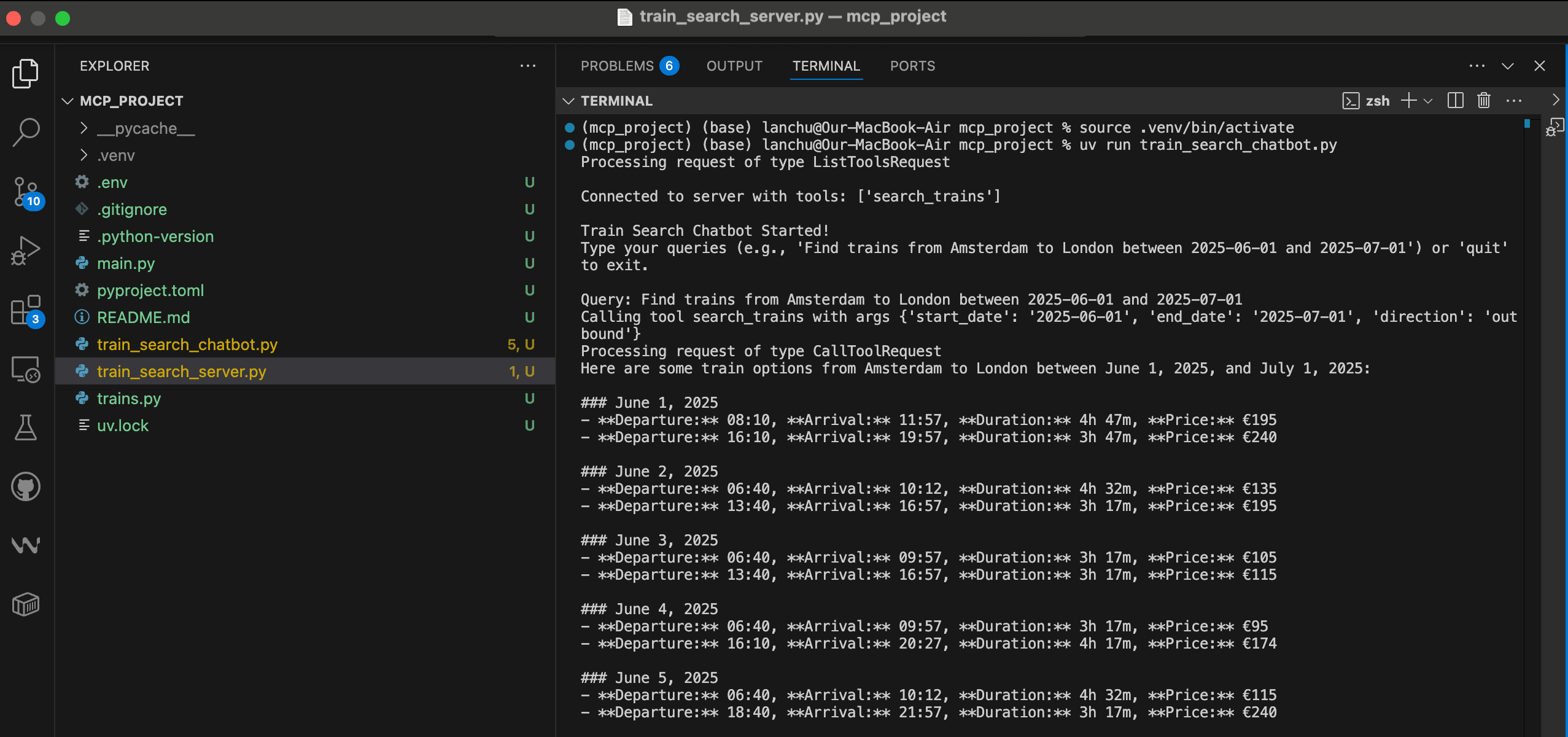 So I decided to build something small to solidify my MCP understanding. I am planning a short trip to London this summer, but the train tickets from Amsterdam are quite expensive. I already had a scraper that scrapes ticket prices, so I thought: why not expand it further by adding MCP components? It’s a great way to learn the new concept by getting your hands dirty and building something practical.