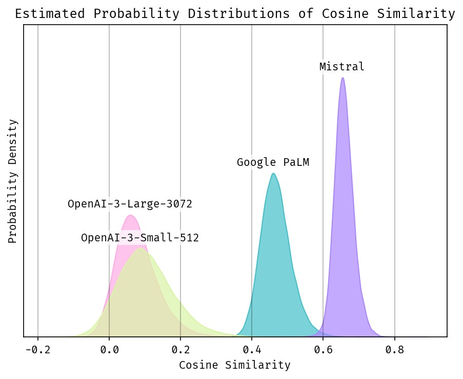 Mistral and Google PaLM show narrow similarity ranges, with most scores clustering tightly (e.g., Mistral between 0.6 to 0.8, PaLM at 0.4 to 0.6). OpenAI’s newer models - 3-large and 3-small exhibit broader ranges, with scores distributed more evenly from -0.2 to 0.4. This is closer to our intuition that “1” means very similar and “-1” not so similar.