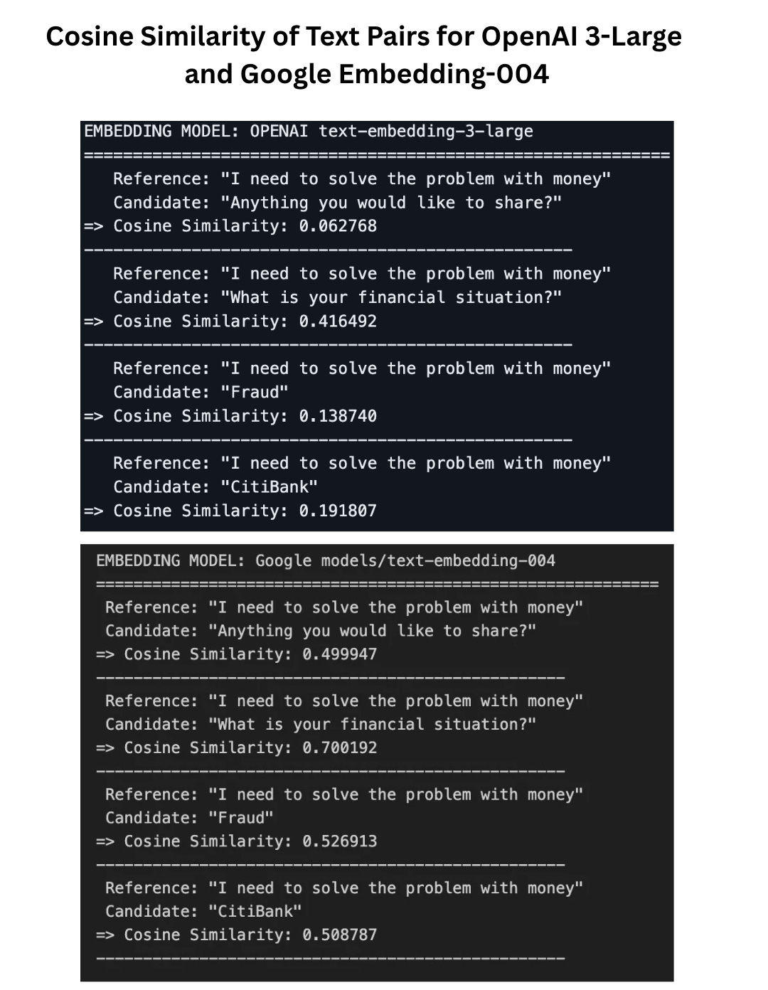 Let’s take a look at a few examples to get a better feel for how to interpret the cosine similarity score, by comparing an OpenAI embedding model with one from Google.
