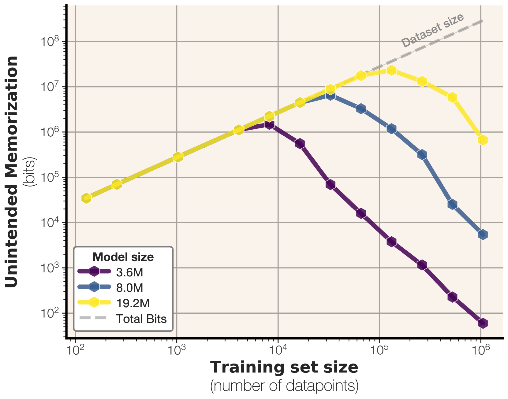 A new research paper on how large language models memorize information. The researchers find scaling laws that tell us how much information is memorized by an LLM before it starts to generalize. Surprisingly, all models that were trained followed similar patterns.